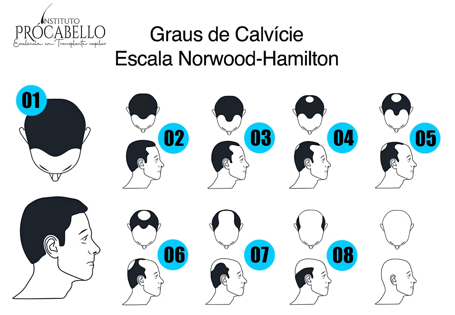 Para o público masculino, utiliza-se a Escala Norwood-Hamilton, que vai do estágio 1 ao 7.