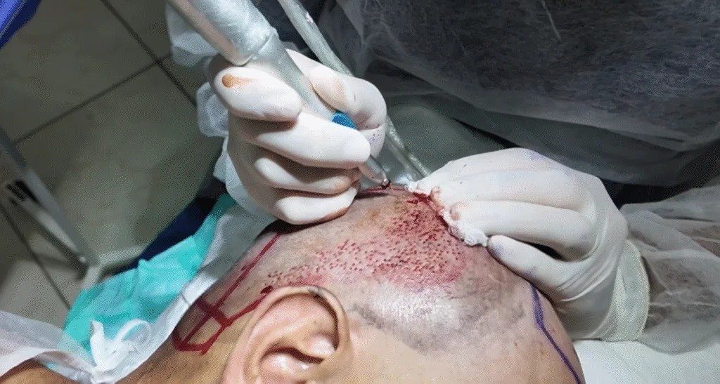 Essa extração pode ser realizada por meio da técnica FUE, na qual uma faixa de cabelo é retirada da área